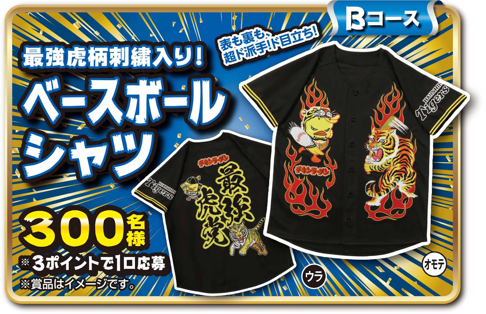 ■ハガキ応募 専用応募ハガキまたは市販のハガキに商品の外装バーコードを貼り付け、①氏名(ふりがな)/②住所/③電話番号/④希望コース(AコースまたはBコース)/⑤(Bコースの場合のみ)ベースボールシャツの希望サイズ(M・L・Oサイズ)/⑥応募口数を明記の上、所定の郵便料金分の切手を貼ってご応募ください。